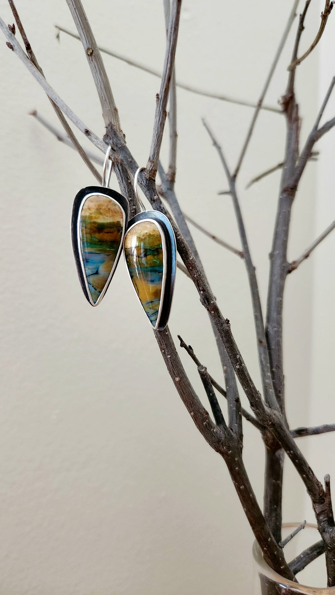 These earrings feature stunning opalized wood cabochons. The setting is very simple as the stones are left to speak for the design. The back plate has been hand sawed to expose these incredible stones and thus making these earrings very light weight. The stones have gorgeous earth tones of caramel, slate blue, rust, black and desert sand. They are absolutely dreamy. The ear wires are soldered to the back.