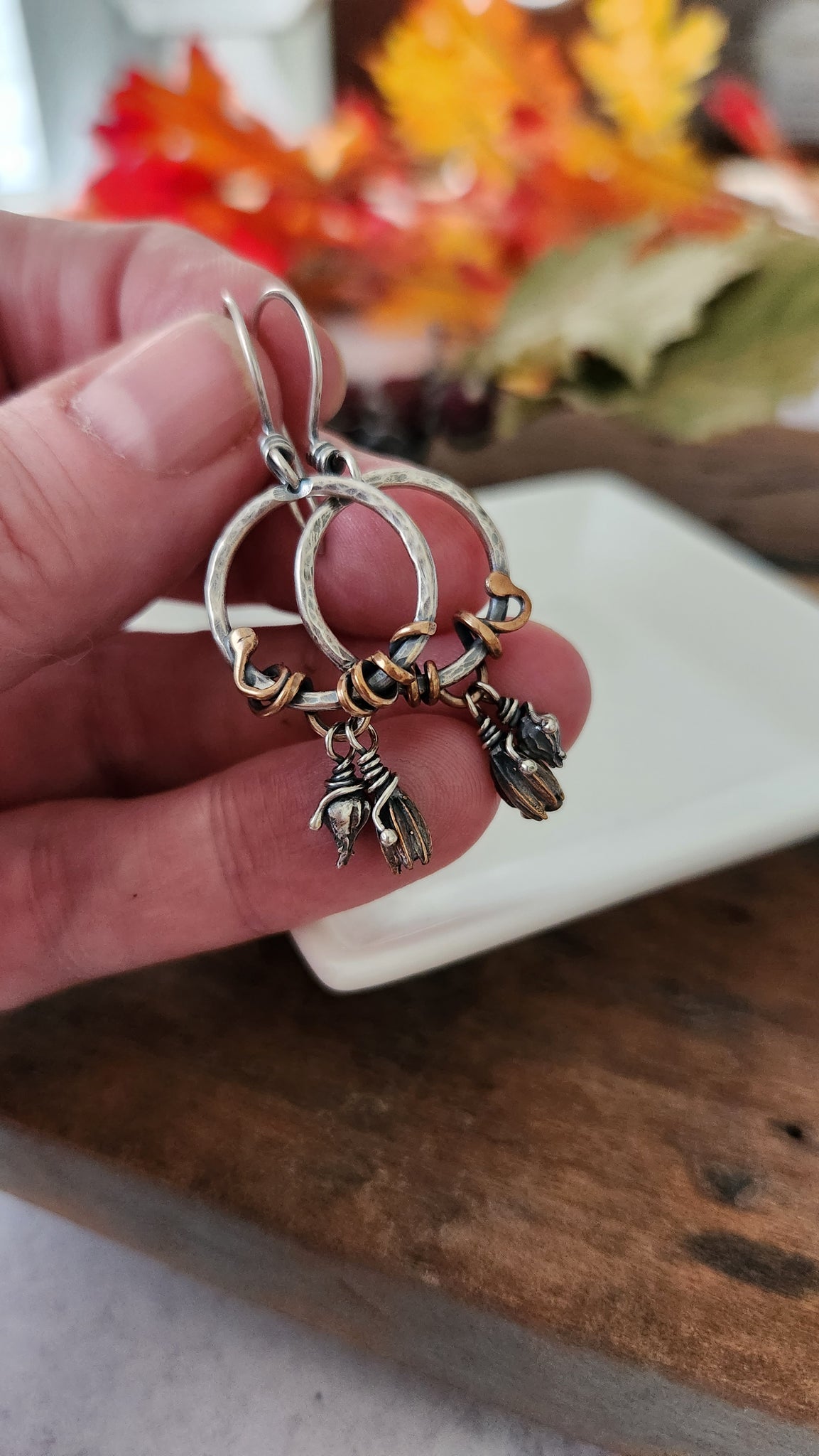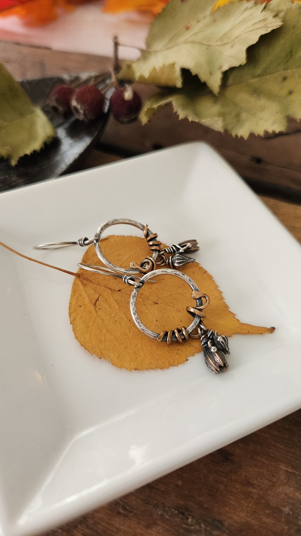 Bronze vines are organically wrapped around dainty sterling silver hoops. I love the warm glow of the bronze against the silver. Together, with seed pods, also of silver and bronze, these earrings capture the essence of autumn. All around, we see the story of the season changing from bright greens to red and gold. We witness the harvest of a summer's labor and know what was will come again in the gifts that nature will leave behind.